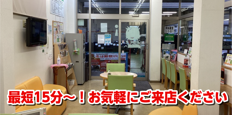 ご予約いただければあまりお待たせせずに作業にとりかかりますので、およそ15分程の待ち時間となります。お客様の混雑状況によっては多少前後することがございます。